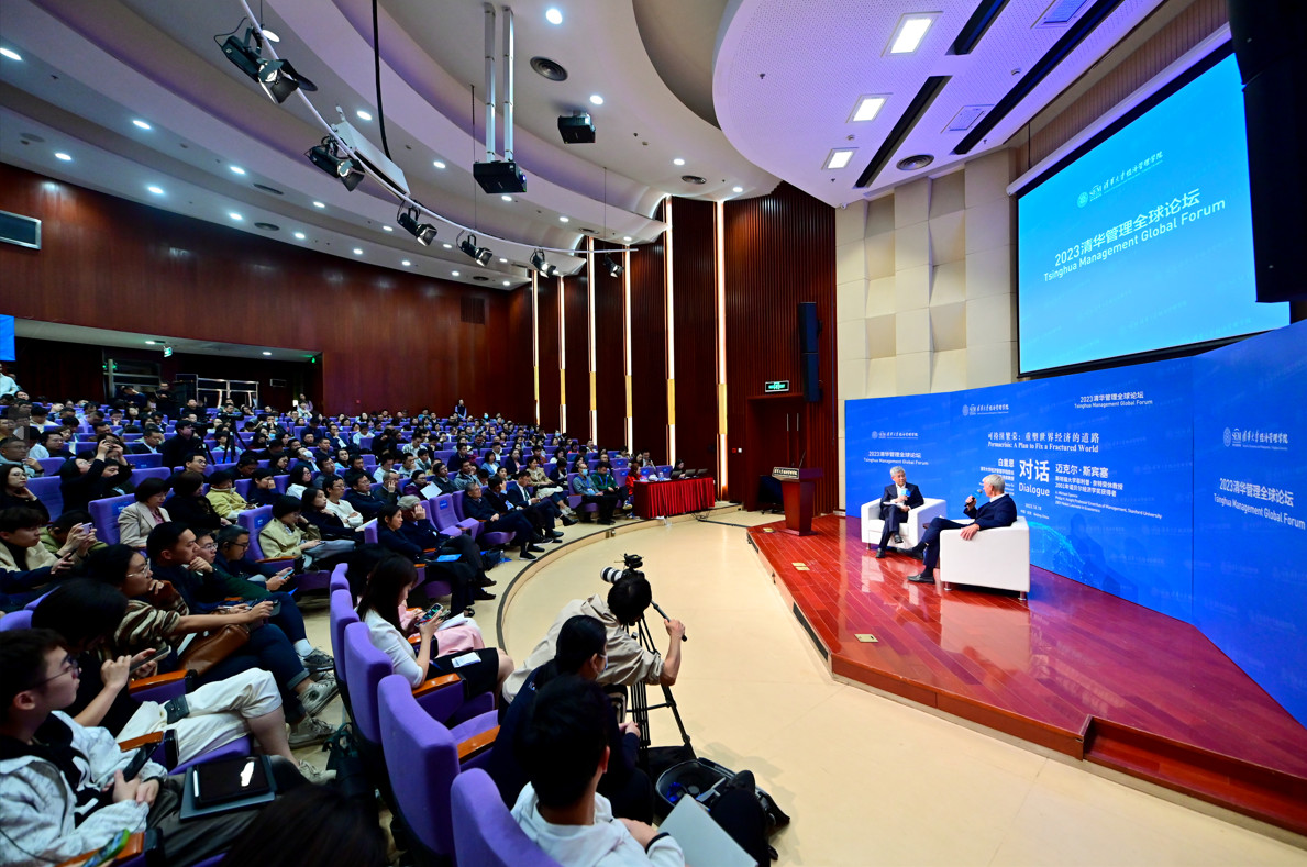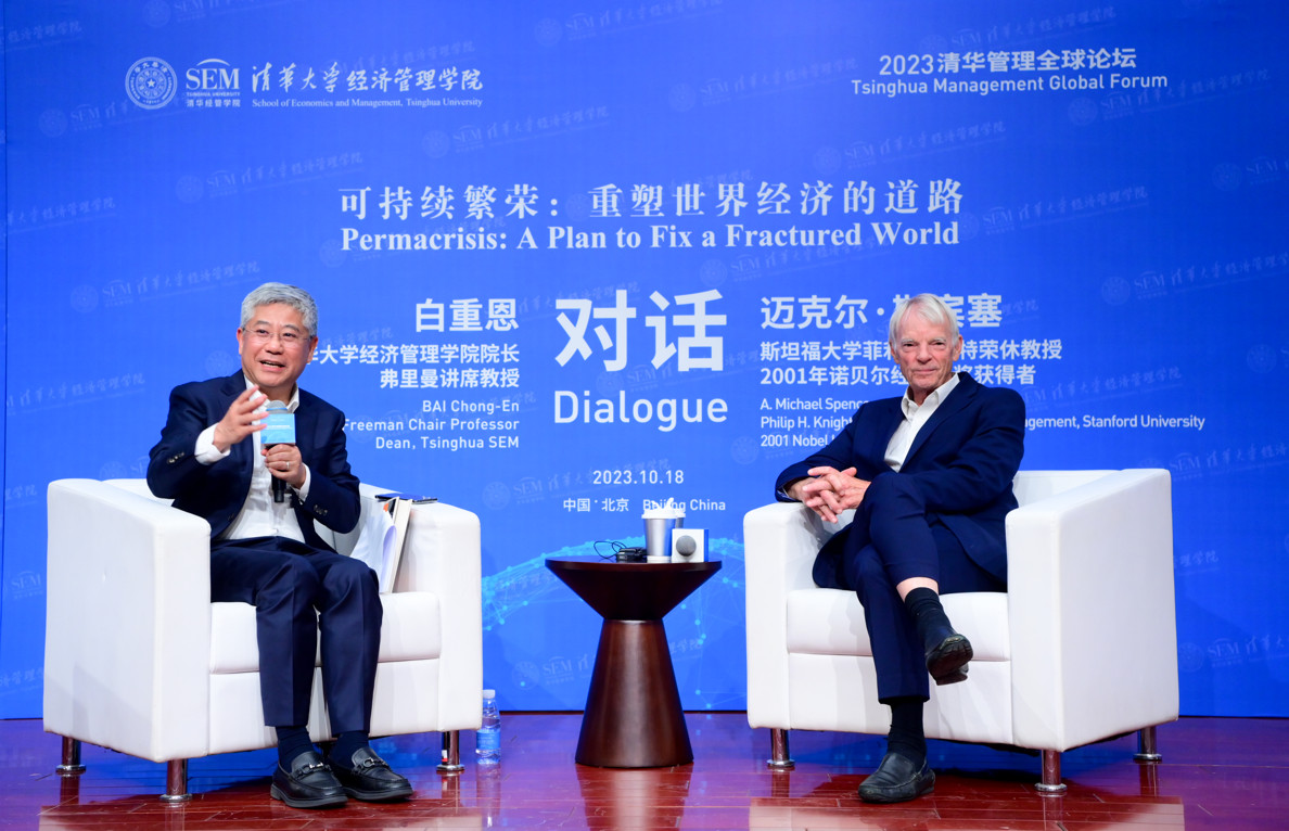 The Tsinghua Management Global Forum, an event attached to the Tsinghua University School of Economics and Management (Tsinghua SEM) 2023 Advisory Board Meeting, took place on October 18 at Tsinghua SEM. Distinguished speakers, including A. Michael Spence, Philip H. Knight, professor emeritus of management at Stanford University, 2001 Nobel Laureate in Economics, and a member of the Tsinghua SEM Advisory Board, and BAI Chong-En, Mansfield Freeman chair professor and the dean of Tsinghua SEM, met to discuss the theme "Permacrisis: A Plan to Fix a Fractured World."
