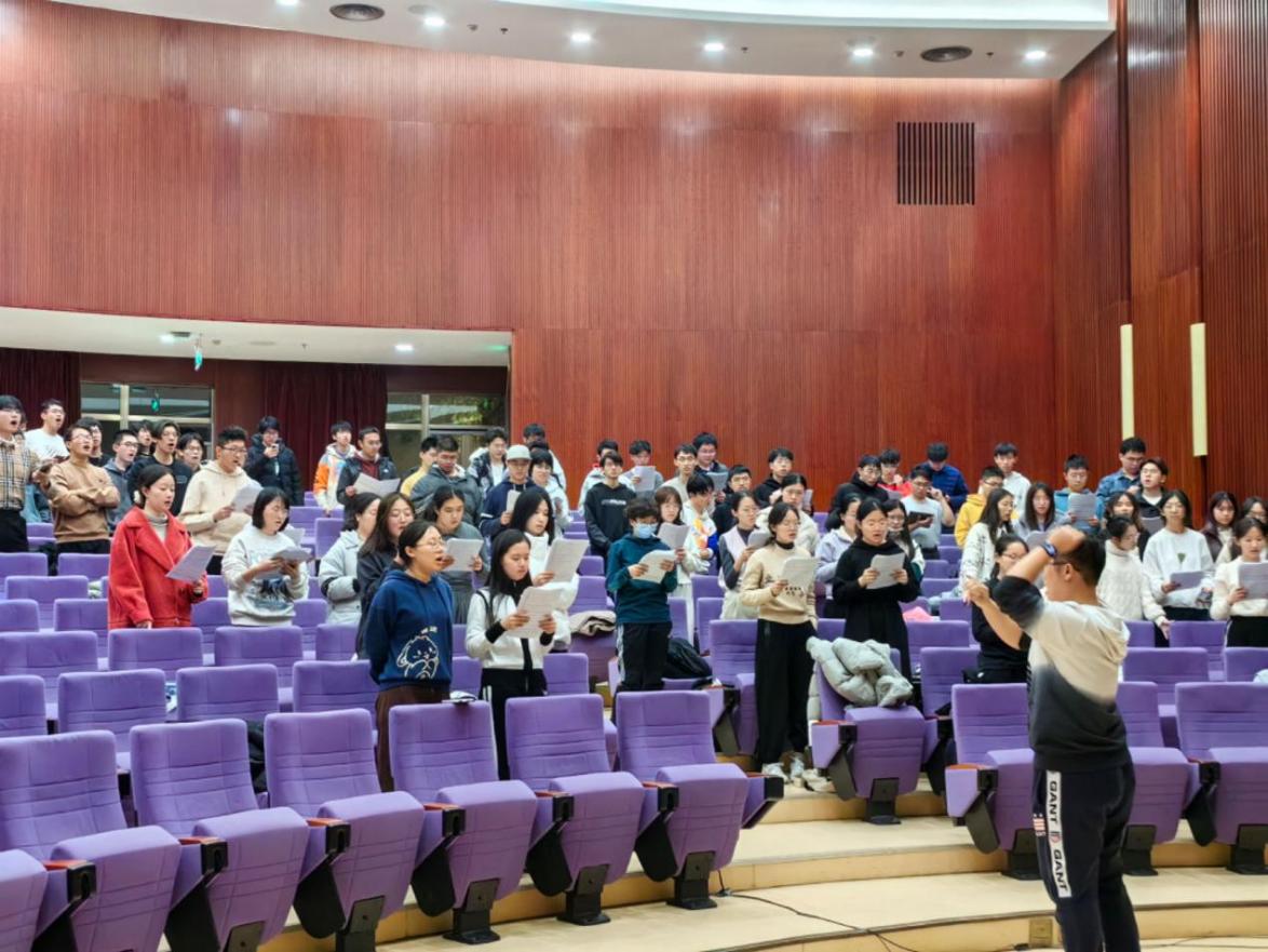 今年,“经建化韵”联队的参赛曲目为《忆秦娥·娄山关》,该曲目以毛泽东同志的同名词作《忆秦娥·娄山关》为歌词,由田丰作曲。抗战时期,毛泽东同志率领红军在娄山关一带激战,获得了长征以来的第一次重大胜利,有感而发写下此作。田丰将其谱成合唱曲,充分展示出了原词的风格和气魄。该曲前半部分音乐节奏紧凑,旋律激昂,展现出紧张激烈的战斗场景;后半部分音乐节奏宽广,旋律高亢,表现出红军英勇顽强、视险如夷的豪迈气魄。同学们用《忆秦娥·娄山关》传递着长征时期红军的豪情壮志和革命乐观主义精神,用歌声表达着对祖国的深深热爱。