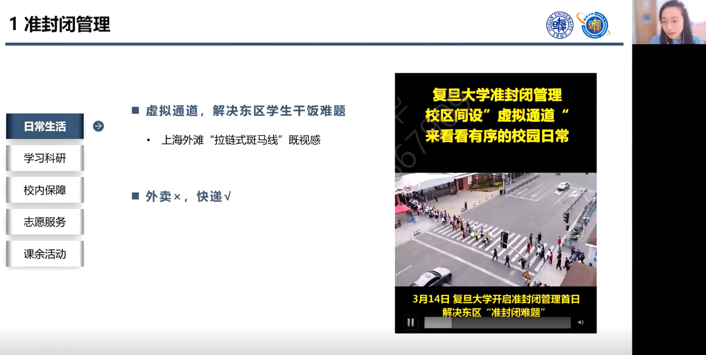 复旦大学管理学院2021级硕博连读党支部林雪颖从日常生活、学习科研、校内保障、志愿服务和课余生活等方面,分享了复旦大学准封闭管理和封控管理期间的校园生活,表达了复旦大学师生对战胜疫情的坚定信念。