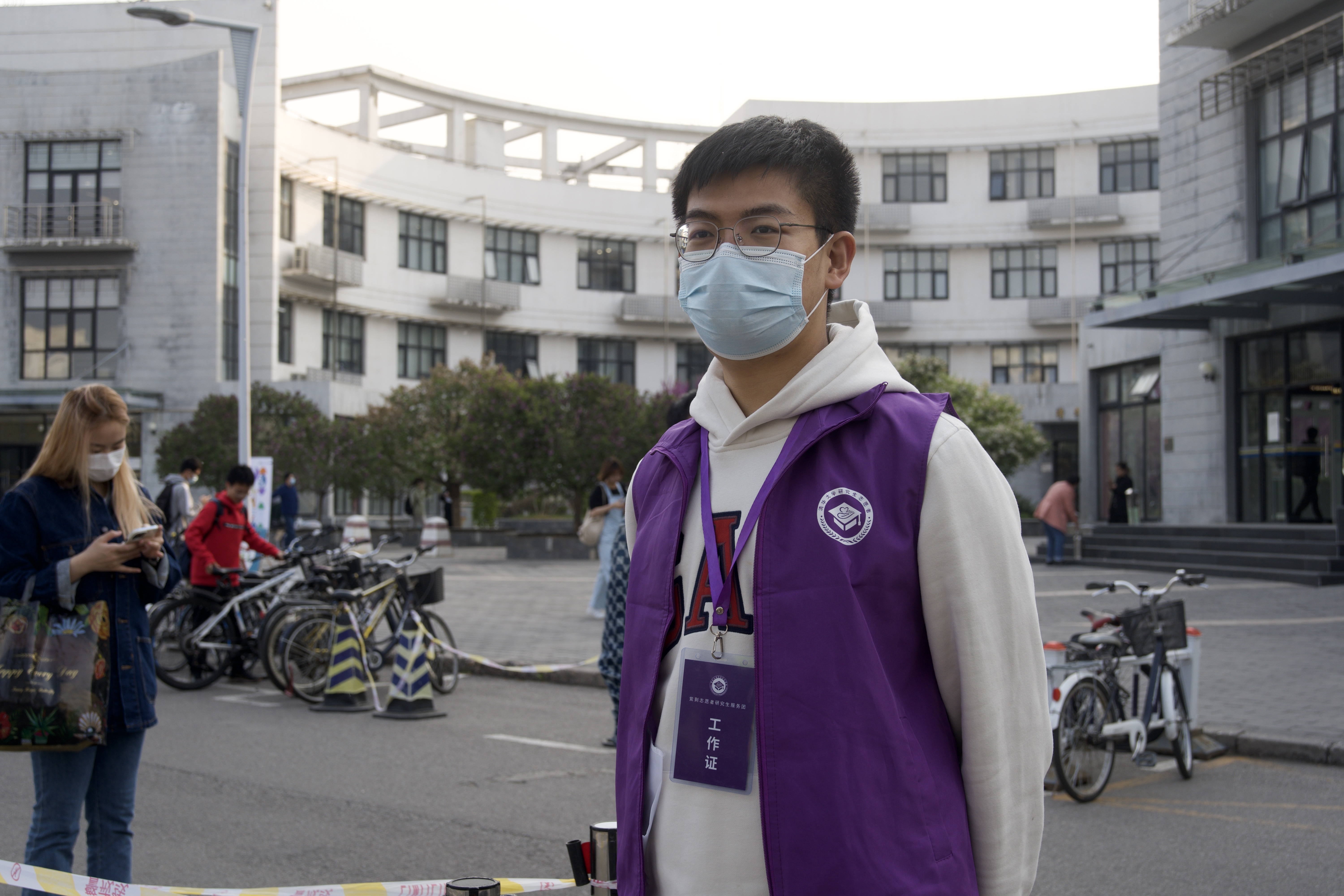 下午1点钟,听涛园西广场和C楼东侧核酸检测点的医生完成到岗,经博20的志愿者整装完毕,他们用饱满的状态开启核酸检测服务工作。有的站在入口处,举着标示提醒同学们扫码预约;有的站在过道旁,提醒检测的同学戴好口罩,做好个人防护;有的穿着防护服,为检测的同学扫码登记。现场保障工作有条不紊,秩序井然。