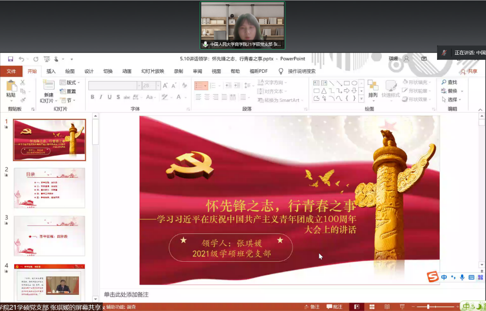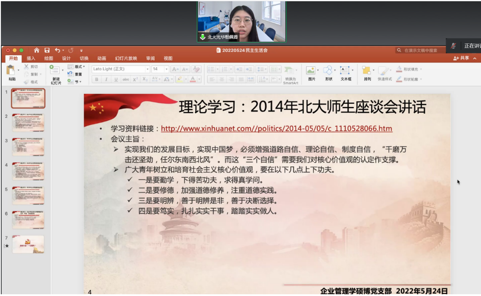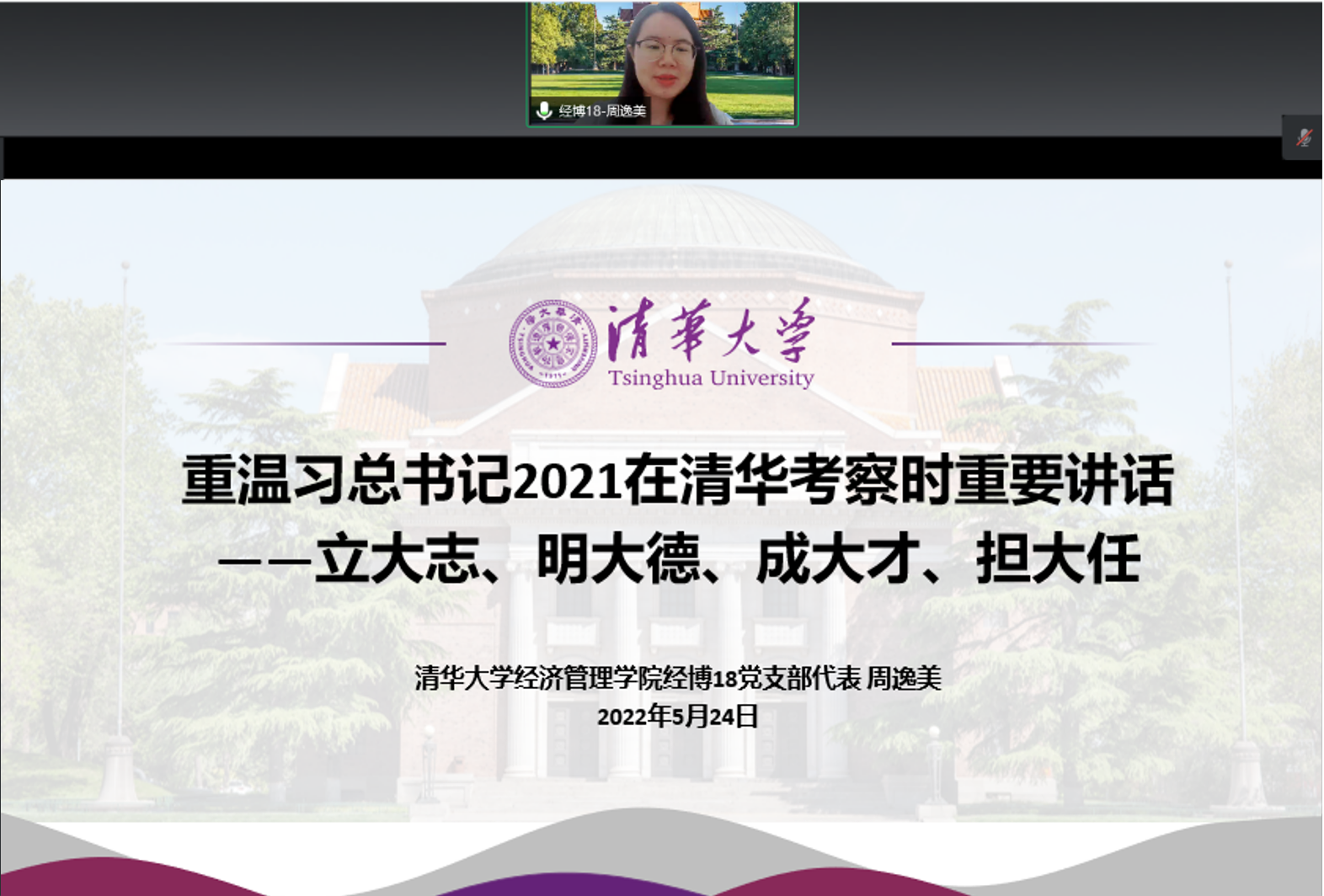 随后,人大商学院2021级学硕班党支部张琪媛以“怀先锋之志 行青春之事”为题,领学习近平总书记在庆祝中国共产主义青年团成立100周年大会上的重要讲话精神。北大光华企业管理学硕博党支部相佩蓉围绕“爱国、励志、求真、力行”领学总书记2014年和2018年在北京大学考察时的重要讲话精神。清华经管学院经博18党支部周逸美从文化自信、科技创新和青年担当三个方面领学习近平总书记2021年在伟德国际1949始于英国考察时的重要讲话精神。人大商学院2021级学硕班党支部代表赵向阳以“凝聚青春 闯出新路”为题,领学习近平总书记2022年在中国人民大学考察时的重要讲话精神。在自由交流环节,三所高校研究生党支部的6位成员依次分享了学习心得与体会。