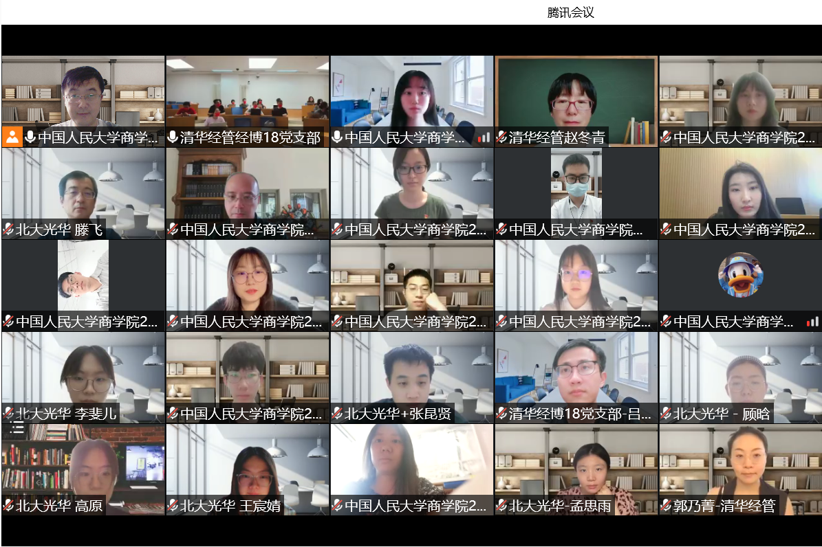 清华经管学院党委副书记赵冬青、北京大学光华管理学院党委副书记滕飞、中国人民大学商学院党委副书记宋华受邀出席,三校研究生党支部的全体党员与积极分子近80人参加会议。