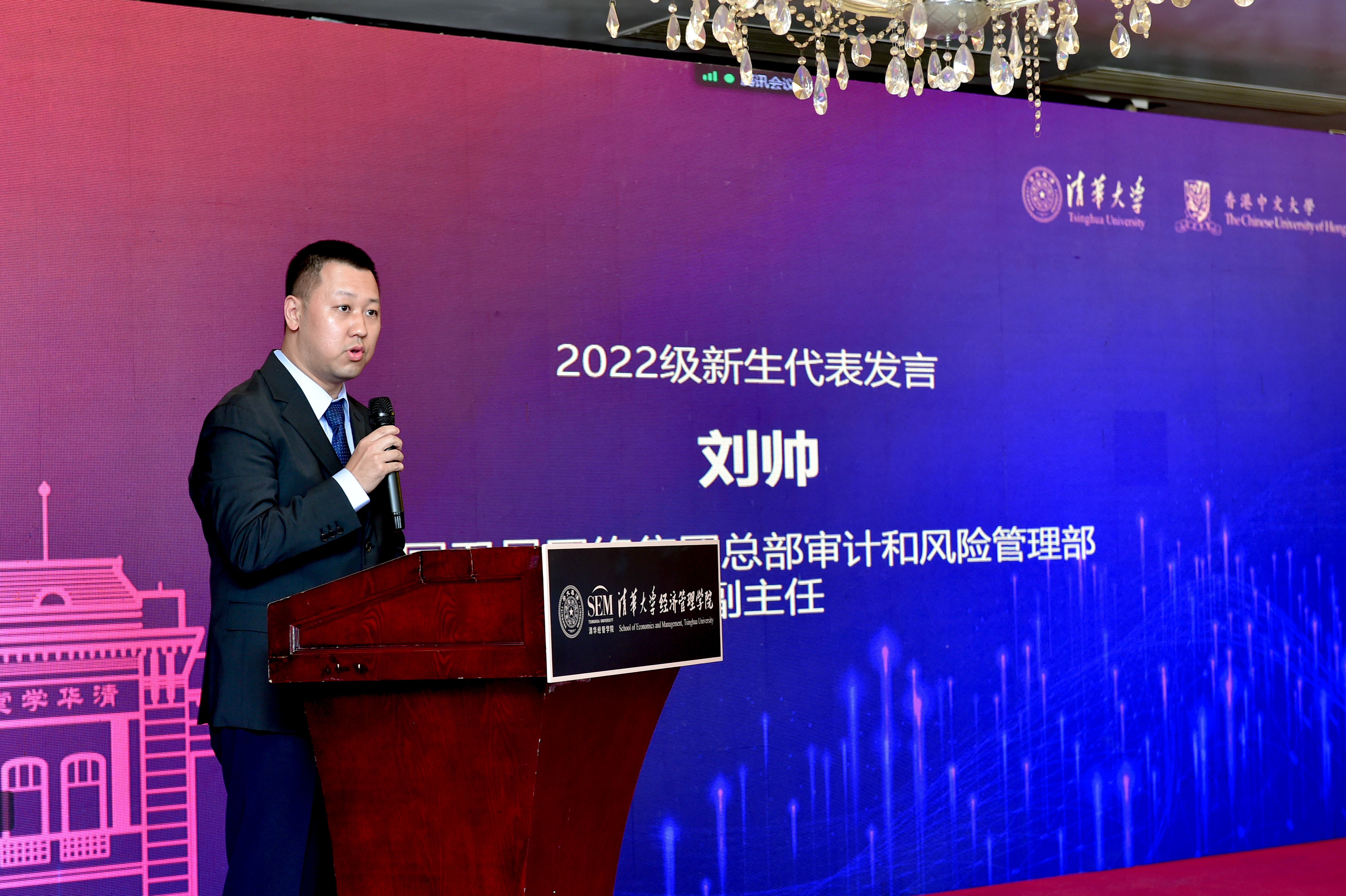 来自中国卫星网络集团的刘帅作为FMBA2022级新生代表发言。刘帅说,当前全球科技前沿领域存在诸多未知和挑战,产业链的底层逻辑已经发生了深刻变革,期待通过金融财务学科的基本理论学习并深化理解,依托金融、财务的赋能,为科技插上资本的翅膀,创造深远的商业模式和价值。