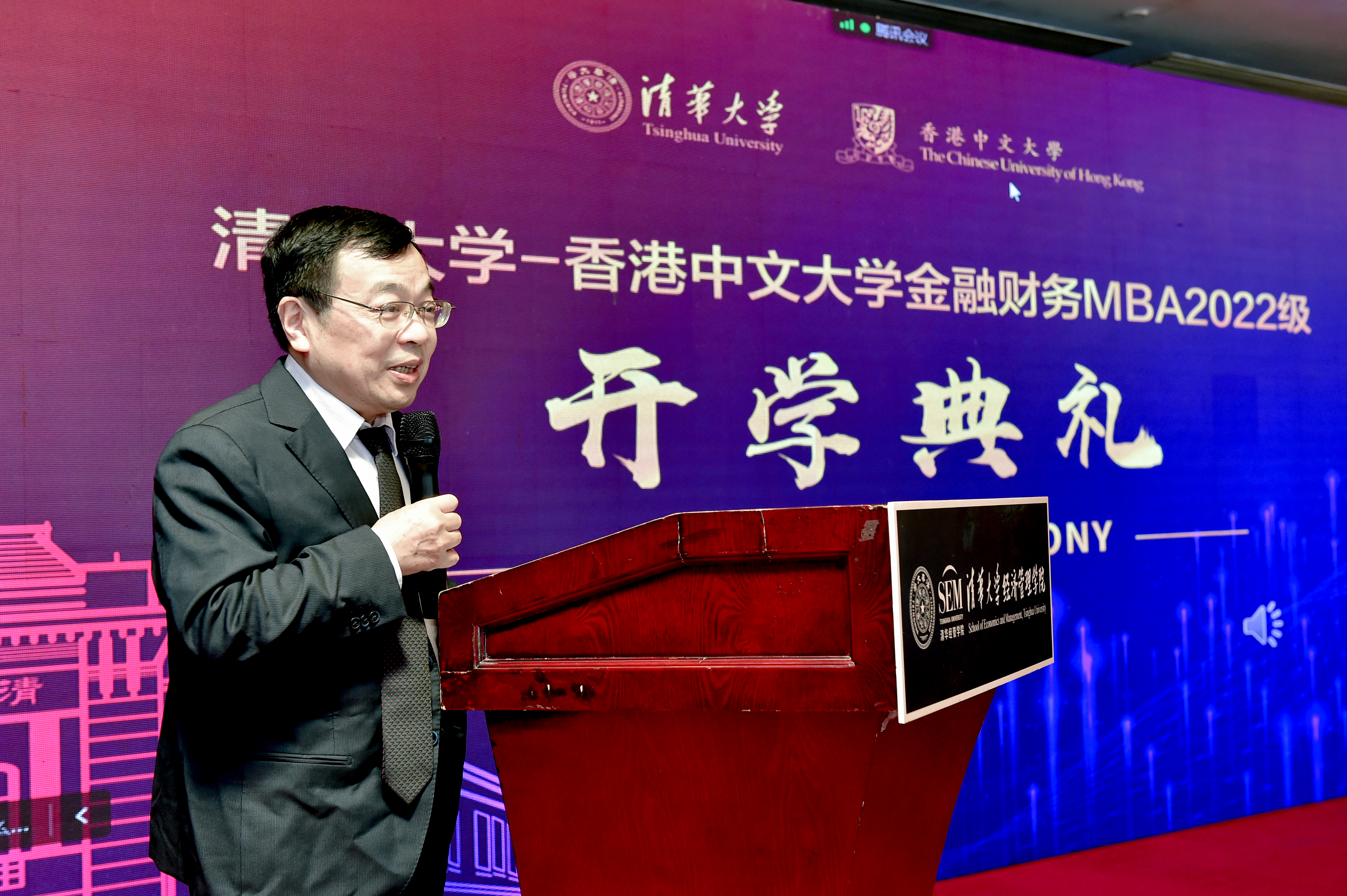 香港中文大学商学院院长周林教授发表视频致辞。他首先欢迎新生成为清华人和港中大人。二十多年来,FMBA课程已经建立起强大的基础和网络,培养了不少领军人物。周林希望大家通过课堂、讨论和研究,提升个人能力,成为德才兼备的行业领袖。2023年,香港中文大学将迎来六十周年。港中大的商学院有着悠久的历史,成绩斐然,正积极融入国家发展大局。他希望同学们能够把握时代的机遇与挑战,好好享受和珍惜课程带来的知识和交流机会,在过去的基础上有新的突破,寻求更大的进步,创造更大的价值。