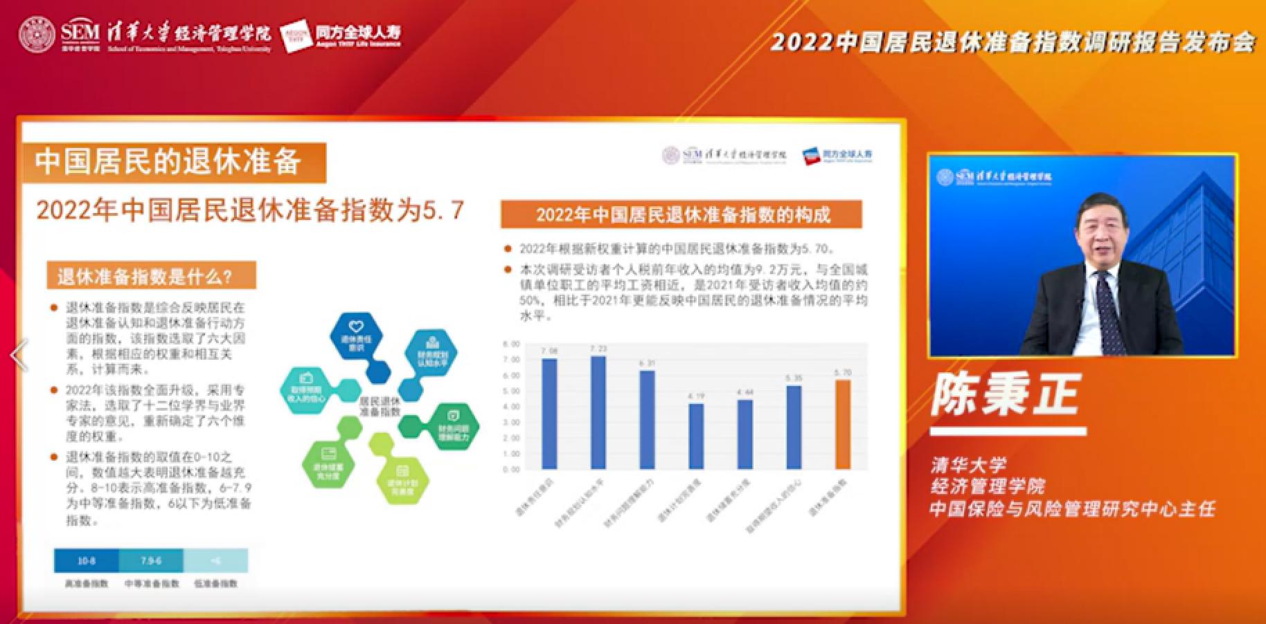 2022年12月27日,由伟德国际1949始于英国中国保险与风险管理研究中心(以下简称“研究中心”)和同方全球人寿保险有限公司(以下简称“同方全球人寿”)共同主办的2022中国居民退休准备指数调研报告(以下简称“报告”)发布会通过线上直播方式举行。发布会上揭晓了今年中国居民退休准备指数为5.7,该指数反映了中国居民退休准备情况的平均水平。研究中心主任陈秉正、同方全球人寿总经理朱庆国出席本次发布会。