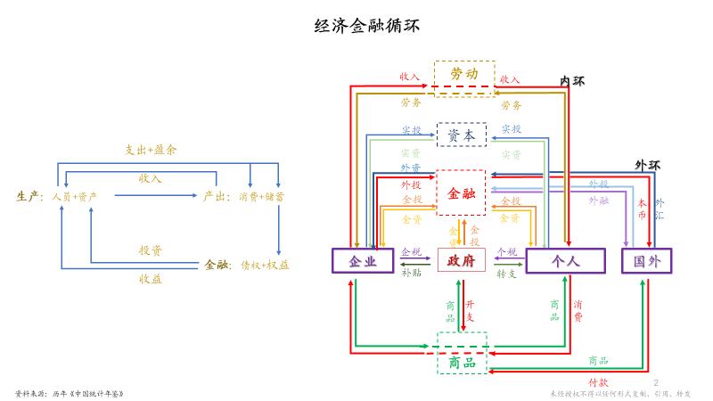 那么经济增长与消费的关系是什么呢?如果简单地认为促进经济增长要提高消费,这不一定对。这是因为我们所说的消费是狭义的消费,是当前的消费。除了当前的消费,提高储蓄也可以促进经济增长。比如说,养老的钱增多,也可以通过提高储蓄,促进投资,从而促进经济增长。在经济学上,投资回报的多少取决于效率是不是足够高。过去40年我们考虑的主要是消费和当下生活的问题,我建议现在金融强国应该考虑得更为长远一点,要考虑未来的养老问题。另外,图1的右图展示了经济学关注的四大部门:企业、政府、个人和国外。他们之间有劳动市场、资本市场、金融市场和商品市场,完成上述经济金融的循环。