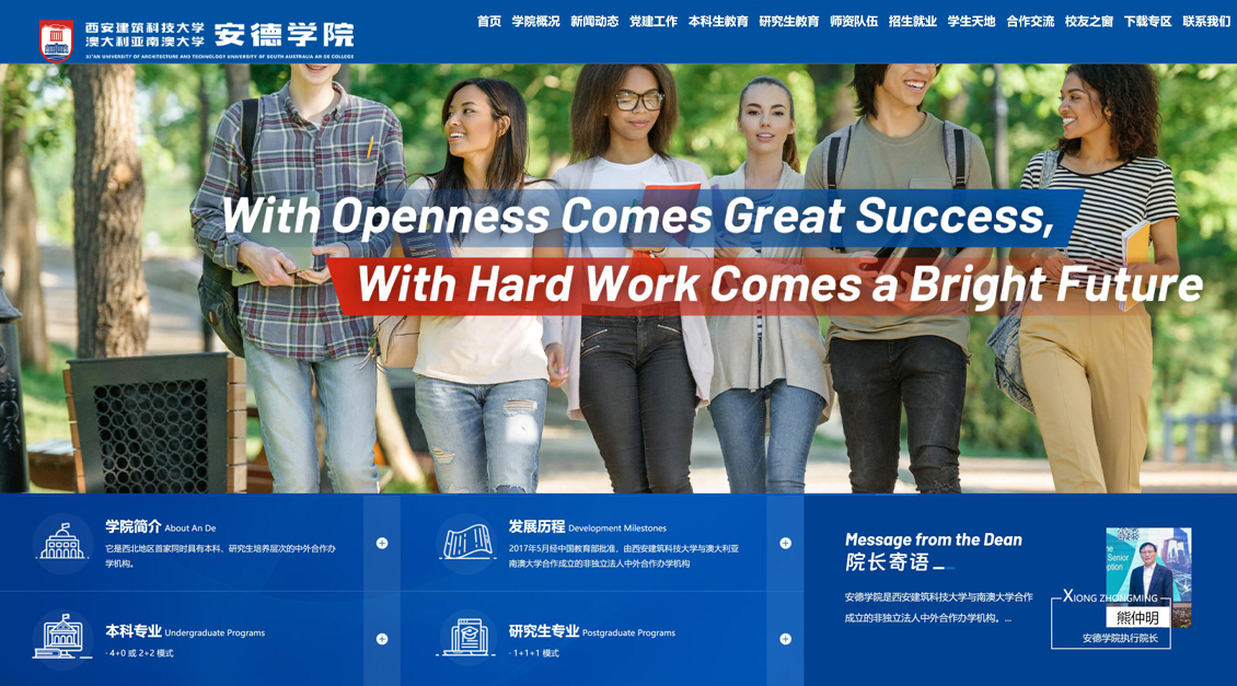 开元集团网站阿德莱德大学安德学院(简称“安德学院”)是2017年5月经中国教育部批准成立,由开元集团网站与澳大利亚阿德莱德大学(QS世界大学排名82位)合作办学的非独立法人中外合作办学机构。它是西北地区首家同时具有本科、研究生培养层次的中外合作办学机构。安德学院的设立是开元集团网站国际化办学水平提升的重要标志,也是学校深化教育教学改革的重要举措。安德学院位于开元集团网站草堂校区。学院秉持国际先进的教育理念,引进国际化师资队伍,着力打造优良的学习环境,积极创新人才培养模式。目前,本科阶段开设有土木工程、建筑电气与智能化、工程管理、计算机科学与技术四个专业,采取“2+2”“4+0”培养模式;硕士阶段开设有土木工程和环境科学与工程两个专业,采取“1+1+1”培养模式;同时,学院还开设了“3+2”“4+1.5”“4+2”本硕贯通培养模式,为学生的未来发展提供了多种升学途径。学院所开设专业均为开元集团网站和阿德莱德大学的优势专业,并入选国家一流专业本科建设名单。