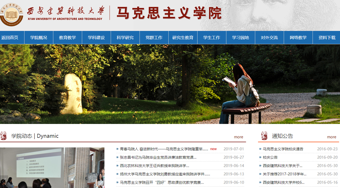 2022年8月学院入选陕西省重点马克思主义学院。马克思主义学院承担全校各类学生的思想政治理论课教学与研究工作,现有“习近平新时代中国特色社会主义思想概论”、“马克思主义中国化”、“马克思主义基本原理”、“思想政治教育”、“中国近现代史纲要”、“自然辩证法”、“创新创业教育”、“研究生思政课教研室”等八个教研室;“马克思主义理论”、“哲学”两个一级学科硕士点;“陕西省大中小学思政课一体化协同创新研究基地”、“新时代乡村振兴战略研究科普基地”两个省级教学科研平台;一个“陕西高校思政课省级名师工作室”;“生态经济文化”、“工程技术与社会”、“政治与社会发展”三个研究所和一个馆藏各类图书23660余册、知名期刊200余种、音像资料170余部、占地120平方米的图书资料室。在雁塔和草堂两个校区拥有教学、办公、教辅用房总面积为1112.67平方米。